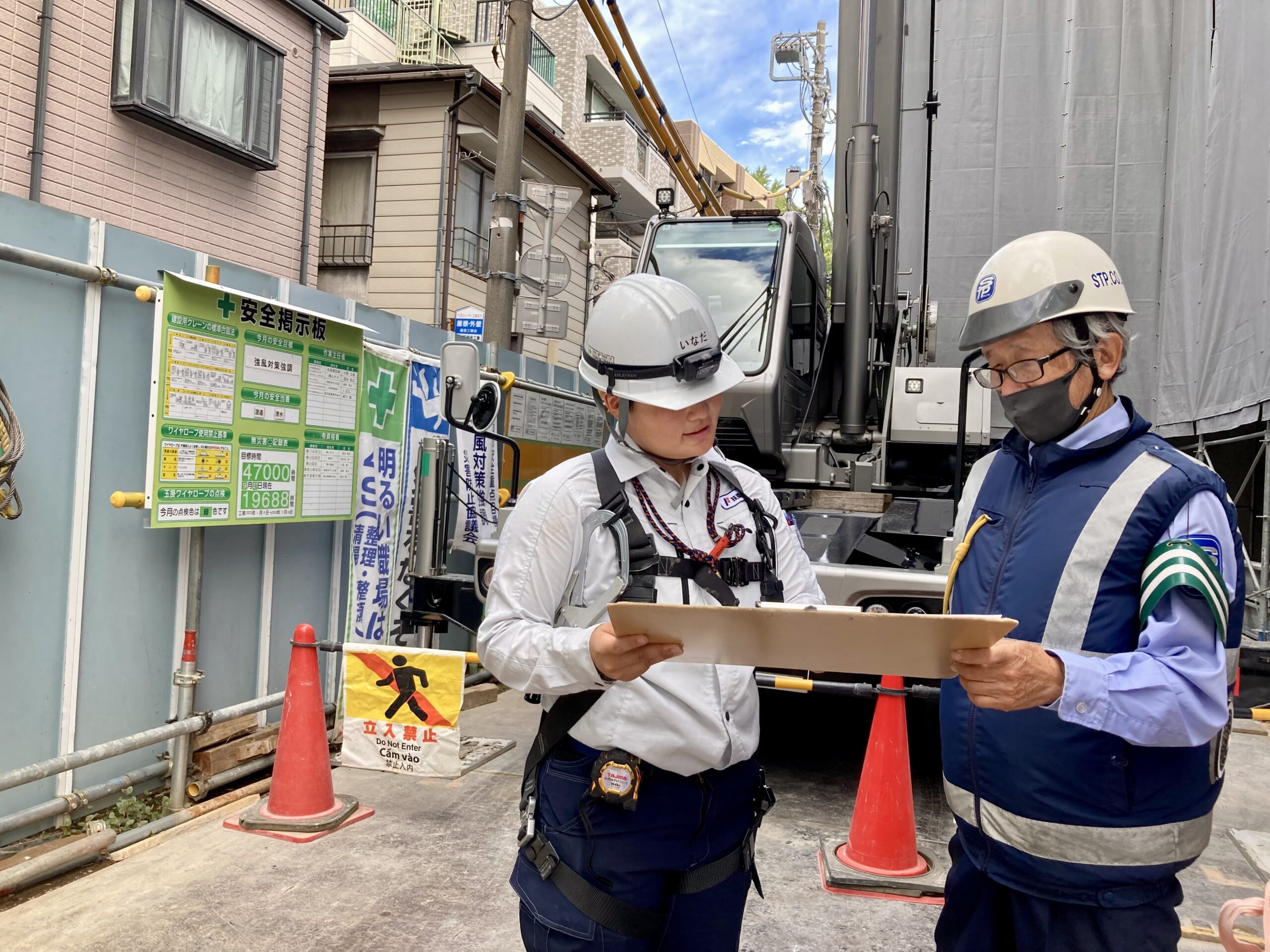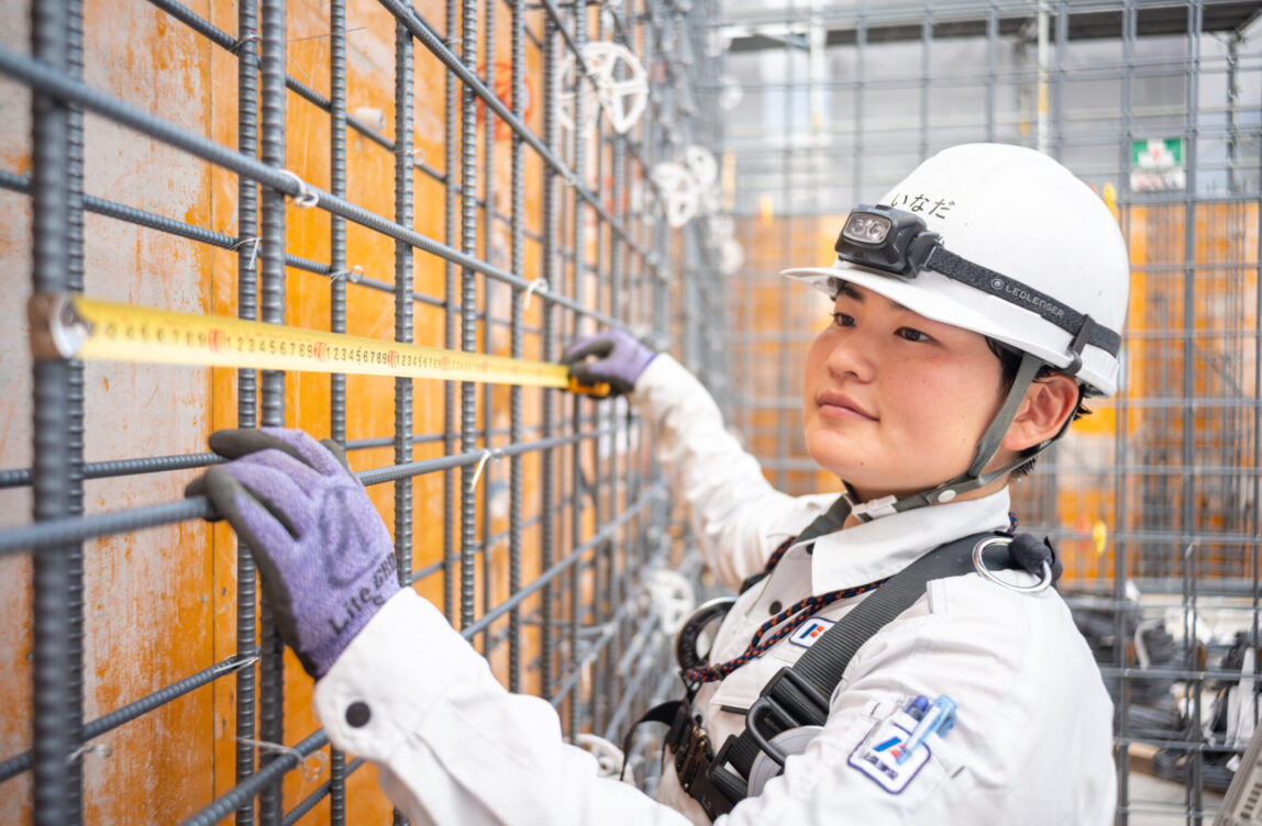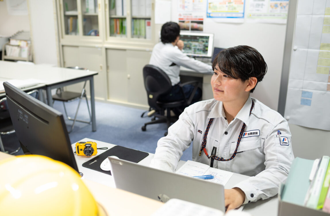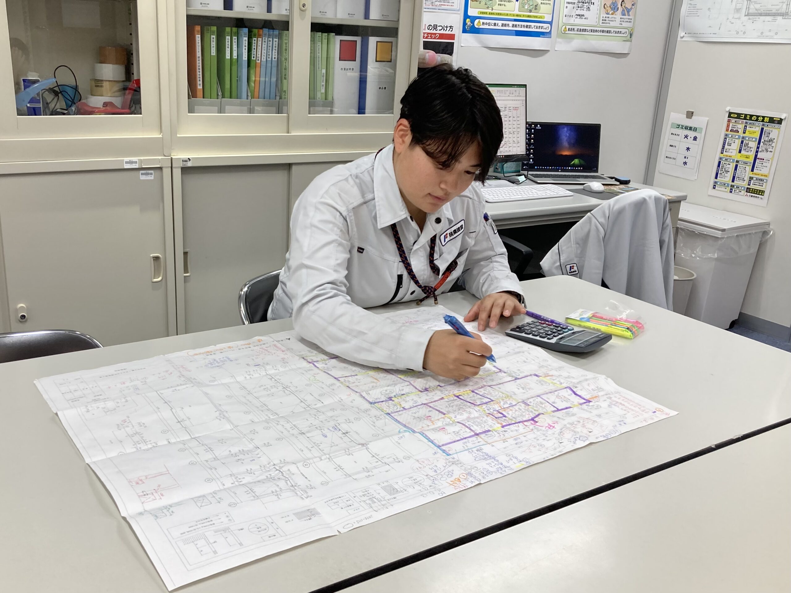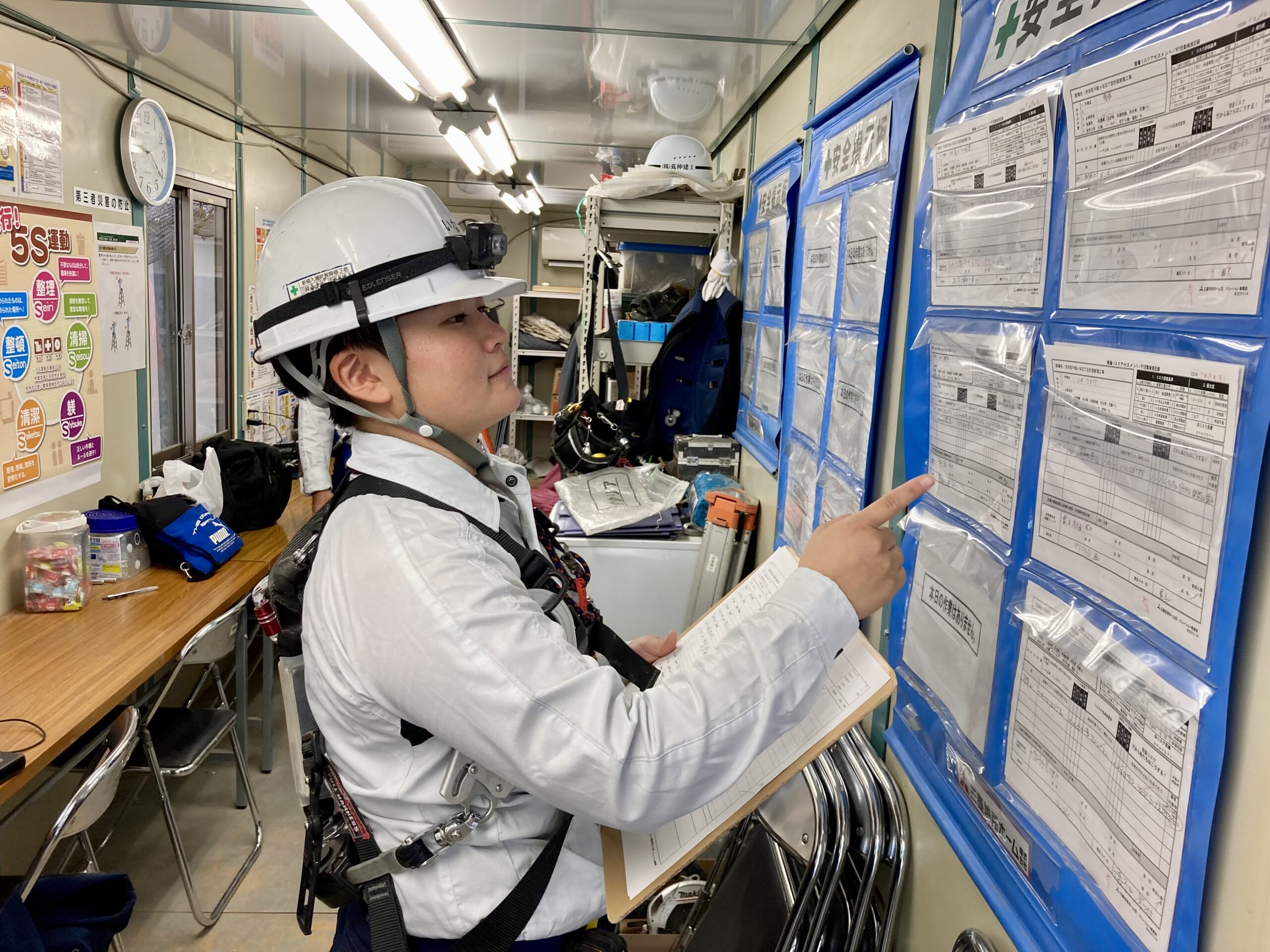 現場の安全管理や安全書類の確認、朝礼・昼礼、新規入場者教育、KY(危険予知)確認といった基本的な業務に加えて、先輩方に教えてもらいながら現場の段取りも行っています。簡単な図面を描いたり、コンクリート打設時の数量拾い、配筋写真や各作業の施工状況写真の撮影なども行います。