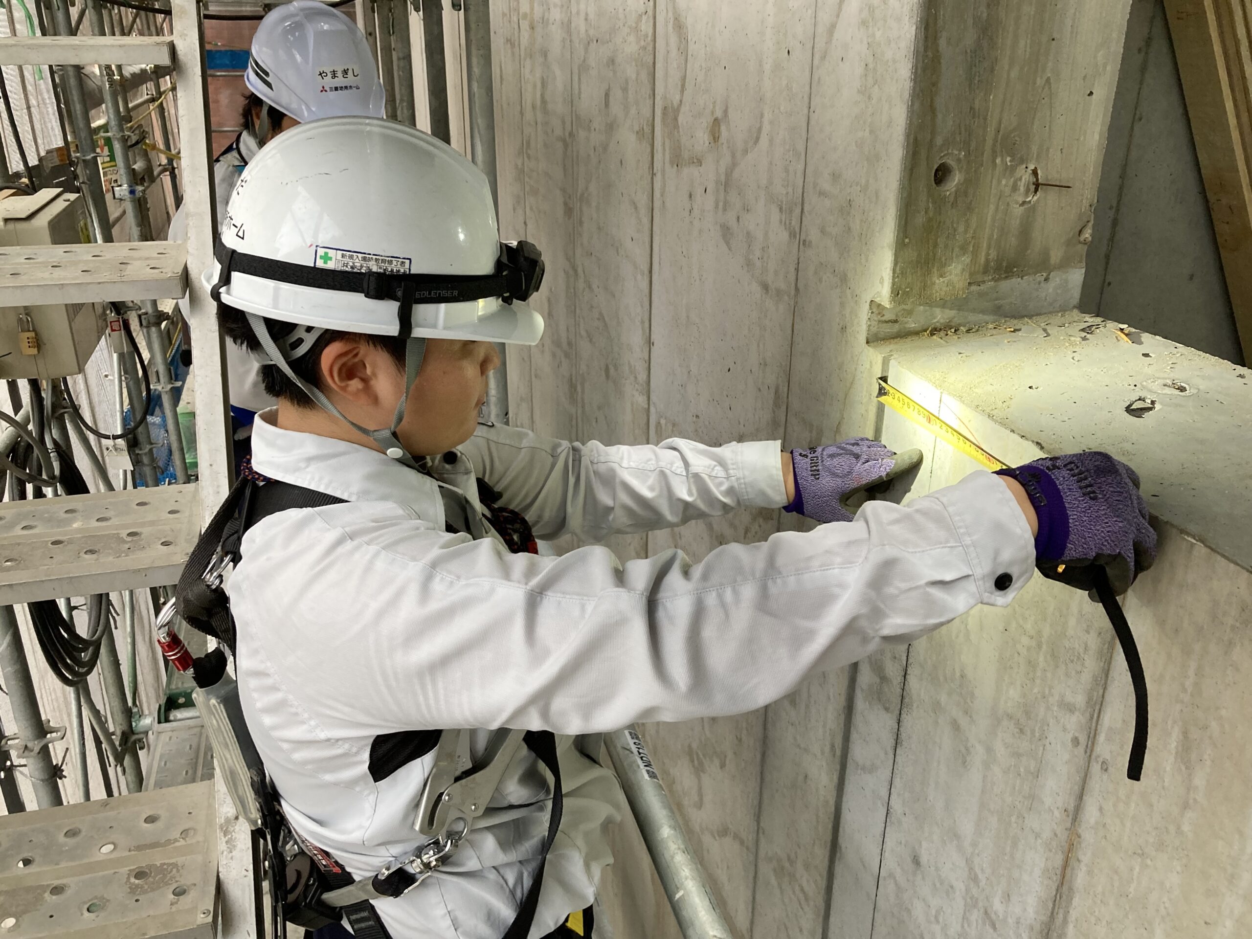 現在担当している新築現場では同じ階のコンクリートを2回に分けて打設していますが、1回目と2回目の打ち継ぎのところにしっかりとコンクリートを充填させるために、細い竹で突くことが大事だと所長に教えていただきました。長く細い竹を最初に見た時は、何に使うのか分からず驚きましたが、実際にやってみると仕上がりがとても綺麗で、電動バイブなどに頼るだけでなく、昔ながらのやり方を取り入れることも大切なのだと知ることができました。