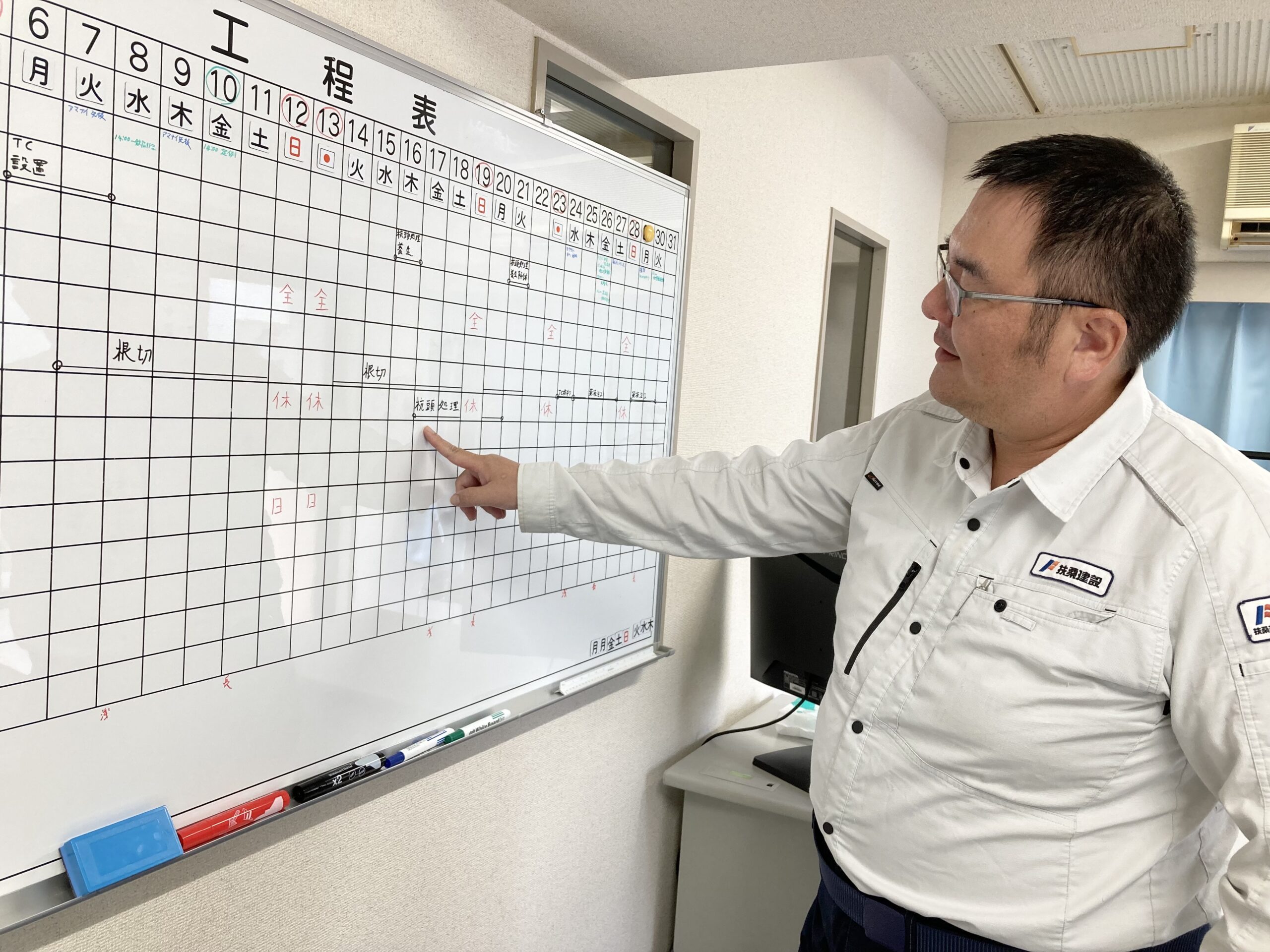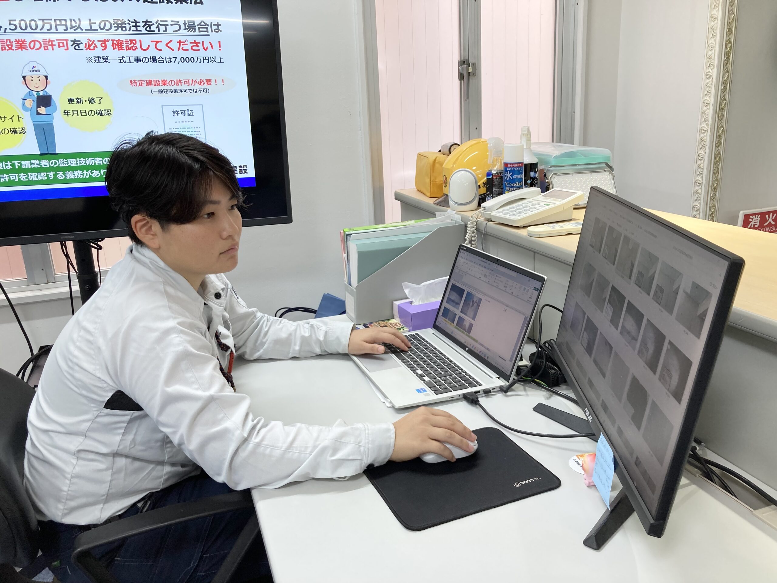 事務所に出社したら朝礼までに現場の確認や朝礼の準備を行います。